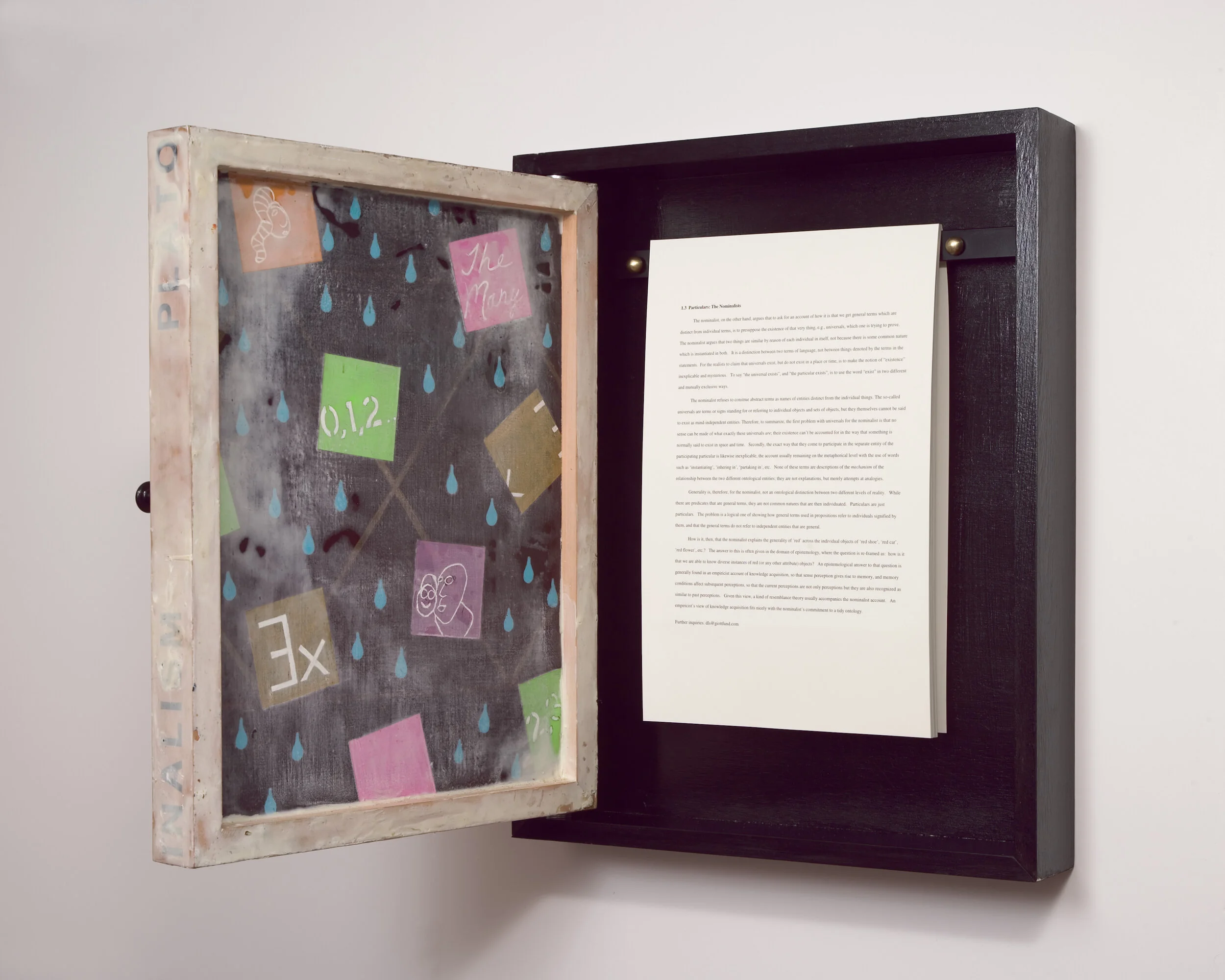 talkPOPc began, accidentally almost, in 2012 with an exhibition I, Dena Shottenkirk, did at the University of the Arts in Philadelphia. It differed from the usual exhibition in that I devoted one room to philosophers: they were the first talkPOPc Resident Philosophers, though we didn’t know it at the time. Noël Carroll (the well-known philosophy of film expert from CUNY’s Graduate Center), Lindsay Fiorelli (another aesthetician now at Claremont), David Post (technically a professor of law who was also Ruth Bader Ginsburg’s clerk, but philosophically inclined!) and a few PhD students from UPenn milled around and answered questions from those who had come to the opening. The exhibition was work I’d done around the topic of nominalism and Nelson Goodman. I had also just published a book (with Springer) on Goodman, and it was part of the exhibition. There were drawings (depicting the whole of ontology broken apart into individual qualia), a video (about Goodman), and an artists book (about the problem with Goodman’s metaphorical exemplification). All in all, a bit heady. Therefore, (clearly) the need for The Philosophers.
